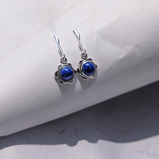 925 स्टर्लिंग सिल्वर में लैपिस लाजुली फूल आकृति पेंडेंट और बाली सेट - ज्ञान और आंतरिक सत्य के लिए