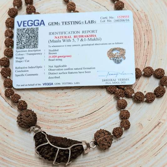 त्रिवेणी शक्ति रुद्राक्ष माला - ज्ञान, धन और दिव्य कृपा (1 मुखी, 5 मुखी और 7 मुखी रुद्राक्ष)