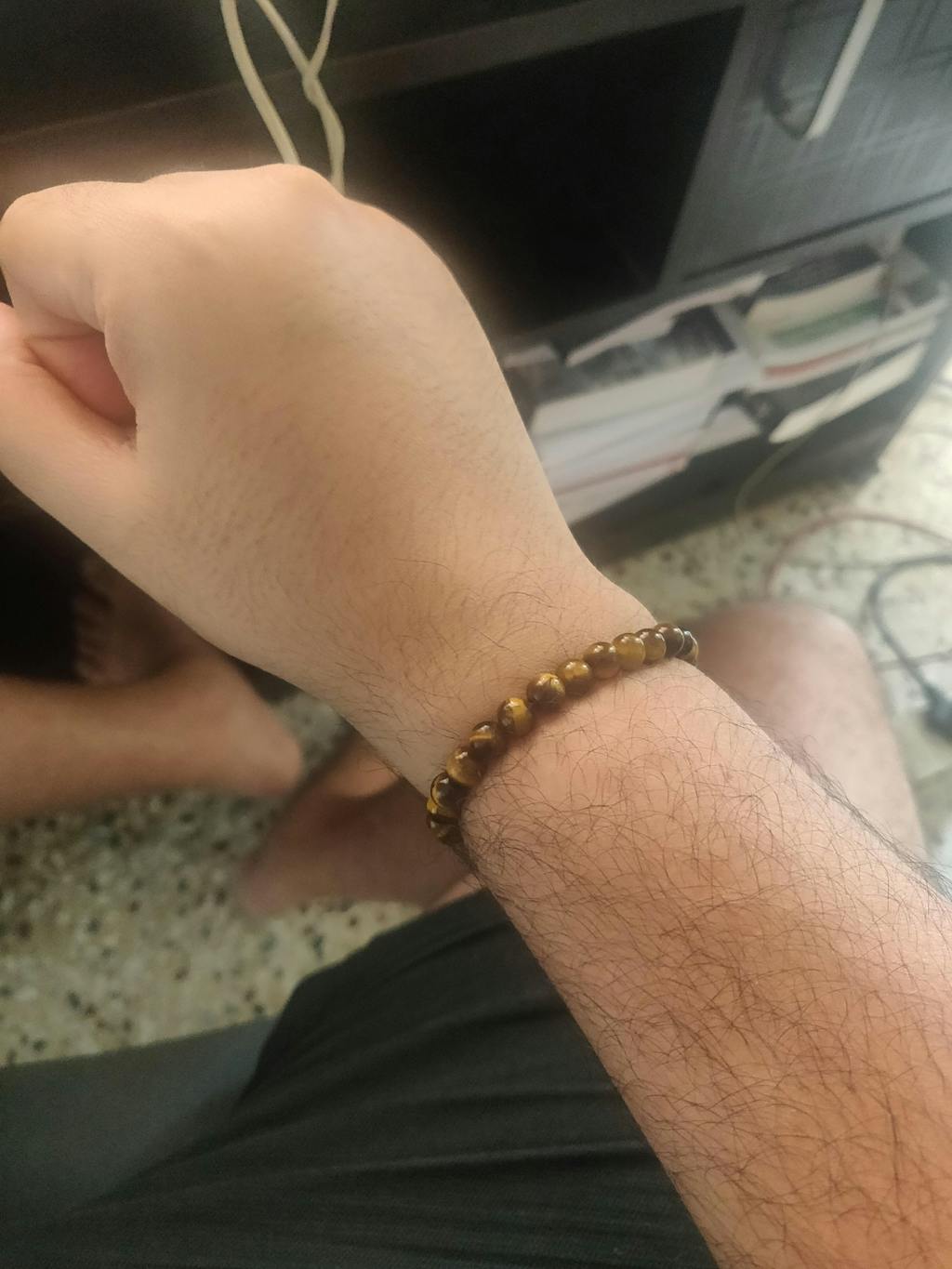 - Tiger Eye bracelet on the right hand fosters a stable connection with the Earth, promoting balance.
